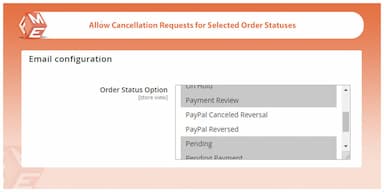 Die Magento 2 Cancel Order by Customer Extension ist flexibel genug, um Stornierungsanfragen in Bezug auf Bestellstatus zuzulassen. Zum Beispiel möchten Sie möglicherweise die Stornierung von Bestellungen, die auf Wartestatus stehen oder sich in Überprüfung wegen Zahlungsstatus befinden, genehmigen und die Funktion für bereits bearbeitete Bestellungen deaktivieren.
