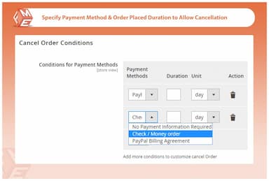 Sie können mehrere Bedingungen für Zahlungsmethoden und eine zeitliche Begrenzung in Tagen oder Stunden festlegen, um Bestellstornierungen zu begrenzen.
