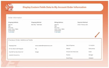 Sie können Ihren Kunden auch ermöglichen, die Daten der benutzerdefinierten Attribute auf der Bestelldetailseite im Abschnitt „Meine Bestellungen“ anzuzeigen. Dies hilft den Kunden, sich daran zu erinnern, was sie eingegeben haben.