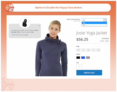 No moleste a los clientes impidiéndoles cerrar la notificación o mostrando constantemente las notificaciones. La extensión de notificación de ventas recientes de Magento 2 le brinda la opción de mostrar el botón de cierre en la notificación emergente y también de decidir si mostrar o no la siguiente notificación después de que un cliente cierre la notificación.