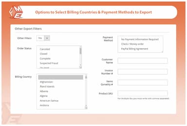 L'extension est assez généreuse lorsqu'il s'agit de vous aider à analyser vos ventes par pays. Vous pouvez obtenir une liste de commandes avec des détails d'expédition spécifiques. Par exemple, vous pouvez exporter les commandes passées par un pays spécifique ou par une méthode d'expédition spécifique. Essayez d'utiliser les filtres suivants :
