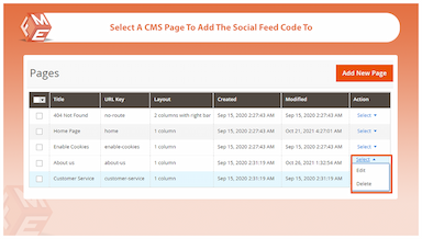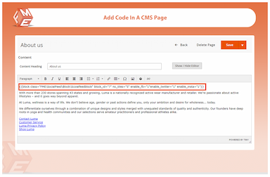 You can display social feeds on a dedicated landing page and/or embed them in any CMS page. By default, a separate ‘Social Feed’ landing page is created. If you want to add a social feed block in one of your CMS pages, you can go to that page’s content from the backend and add the following code.