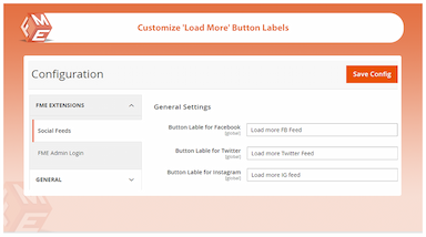 Give custom labels to the ‘load more’ button for each feed. The ‘load more’ buttons appear when you display social feeds on a CMS page. The code allows you to control the number of posts to load by default. The same number of more posts will load upon clicking the button.