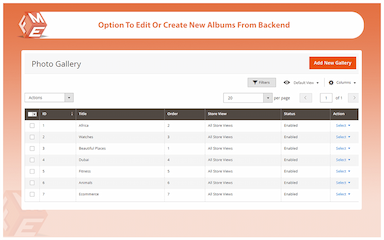 Il modulo Magento 2 Photo Gallery crea una pagina galleria separata in cui puoi aggiungere album fotografici dei tuoi prodotti, eventi aziendali, e dipendenti, ecc. Puoi facilmente organizzare e assortire le fotografie in diversi album.
