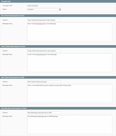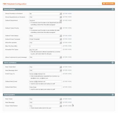 You can customize settings from configuration options such as ticket priority, default department, status, default email and auto response.