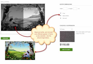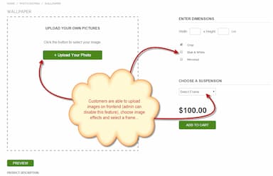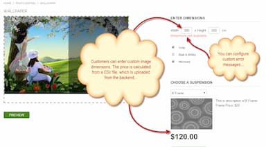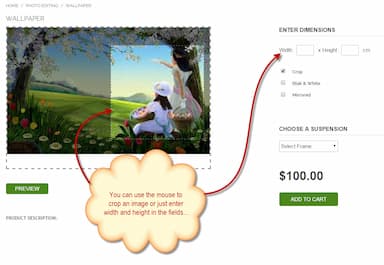This Image picker extension for Magento allows your customers to crop an image, add frames, apply color effect and purchase the cropped photo. This module is suitable for image-based websites e.g., artists portfolio. Customers are able to upload images on frontend, and then crop the image as required. There are two options for cropping, first one is to use mouse pointer, and second one is to enter custom width and height.