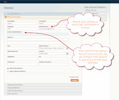 When a customer purchases a product or products of specific quantity from your store, he can enter an additional email address on a separate field of the Billing section. This will be the Invoice email address on which the billing email will be sent along with the PDF copy.