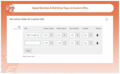 The Magento 2 NoIndex NoFollow Tags extension lets you enable NoIndex, NoFollow, and NoArchive meta robot tags for individual or grouped pages. You can also configure these tags for custom URLs to manage visibility precisely. By optimising your crawl budget and directing bots toward high-value pages, this extension strengthens SEO efficiency and prevents low-priority content from affecting search performance.
