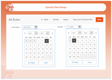 A extensão permite que você especifique um intervalo de datas para a restrição. Isso é útil quando você deseja aplicar a taxa mínima do pedido por um período específico. A regra não será válida antes da data de início ou após a data de término.