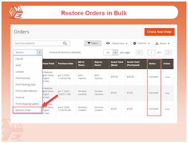 Możesz przywrócić konkretne anulowane zamówienie jednym kliknięciem na stronie szczegółów zamówienia. Aby przywrócić wiele zamówień jednocześnie, wybierz je w siatce zamówień i kliknij „Przywróć” w rozwijanym menu „Akcje”, aby odzyskać je masowo.