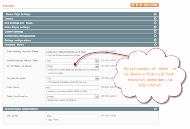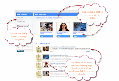 - Slider de Notícias em Destaque personalizável para a página inicial/página de destino. Configure o estilo do slider, animação (swing, ease in quad, ease in back, etc.) e título, entre outros.