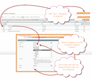 - Criação ilimitada de categorias de notícias com relação pai-filho. A ordenação de categorias é suportada.