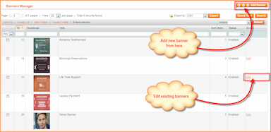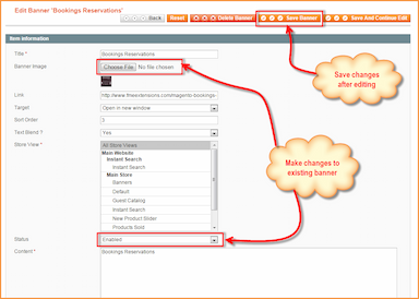 Usando suas credenciais de login, primeiro faça login no painel administrativo do Magento. No painel, selecione Gerenciar Banners na guia Banners. Pressione Editar no campo Ação da imagem necessária para fazer alterações.
