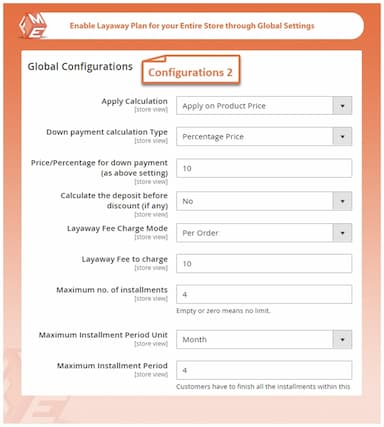 Com esta extensão de Pagamento Parcelado para o Magento 2, é possível configurar configurações gerais que permitem a seleção de métodos de pagamento para os planos de prestações.