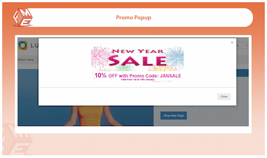 A extensão permite que você faça o upload de uma imagem promocional que você deseja exibir como um pop-up na visita à página. A imagem pode transmitir qualquer coisa, como uma oferta de negócio ou desconto que você deseja que os visitantes aproveitem, ou um evento ou alterações em suas políticas que você deseja informar aos visitantes. A imagem possui um botão de fechar que permite aos visitantes fechar o pop-up.