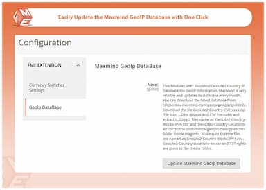 Magento 2 Currency Switcher поддерживается базой данных MaxMind GeoIP для распознавания географического положения пользователей по их IP-адресам. Вы можете обновлять базу данных, чтобы поддерживать актуальные записи.